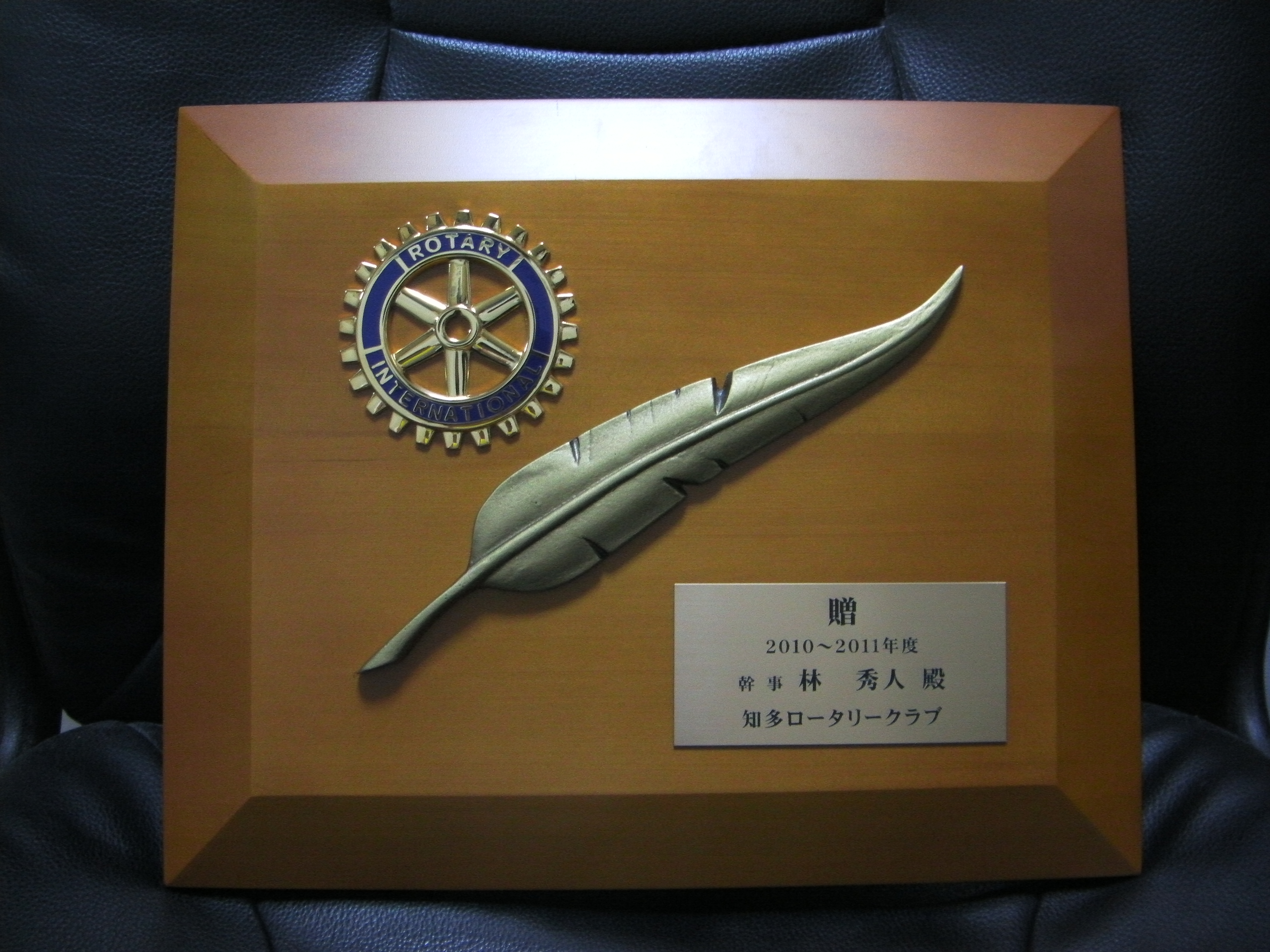 私は知多ロータリークラブに所属し、先月まで1年間幹事という役目をさせていただきました。幹事は会長を支える秘書官にあたります。一昨年に続き2回目の幹事をさせていただいたのですが、写真は退任記念の盾です。